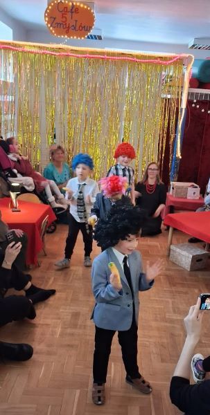 W tym roku po raz pierwszy w przedszkolu mogliśmy gościć Babcie i Dziadków na występie „Café 5 zmysłów” z udziałem naszych przedszkolaków. To niezwykłe spotkanie odbyło się w przedszkolnej kawiarni retro 5 zmysłów. Przy klimatycznych stolikach nakrytych czerwonymi obrusami, przy złotym świetle lampek i muzyce z lat wielkich przebojów Jerzego Połomskiego „ Bo z dziewczynami nigdy nie wie, o nie wie się…”, zabawialiśmy naszych zacnych gości. Koncert życzeń poprowadziła Ania z Yanxim. Stoliki obsługiwał ekspresowy kelner Piotr. A przy stolikach zasiedli młodzi artyści iluzjoniści, którzy dla swoich gości wyczarowali zagadki pięciu zmysłów. Przy stoliku zmysł węchu dziewczynki Marysia i Lilka. Przy stoliku zmysł dotyku chłopcy Olek, Kuba i Olek. Przy stoliku zmysł smaku Basia z Mieszkiem. Przy stoliku zmysł słuchu Madzia z Natanem i Stasiem. I przy ostatnim stoliku zmysł wzroku chłopcy Adaś z Filipem. Dziadkowie wybornie się bawili, wszystkie zagadki „rozbroili”, pośpiewali, potańczyli, pamiątkowe fotobudkowe zdjęcia zrobili i pyszną zimową herbatkę wypili. Nasi młodzi aktorzy po raz kolejny udowodnili, że potrafią świetnie się bawić, śmiać, cieszyć i dzielić się swoją radością z innymi.