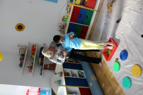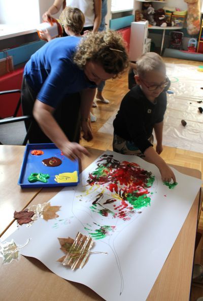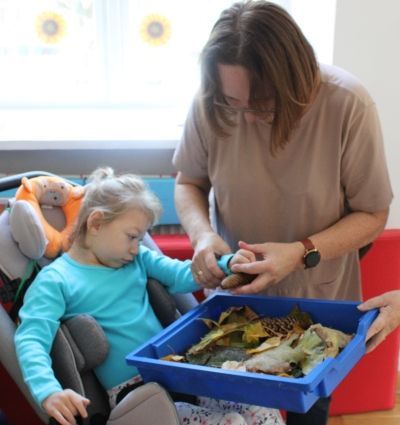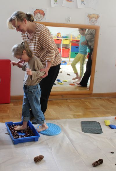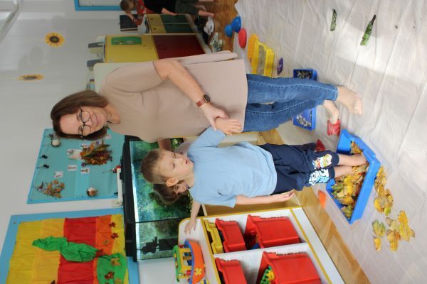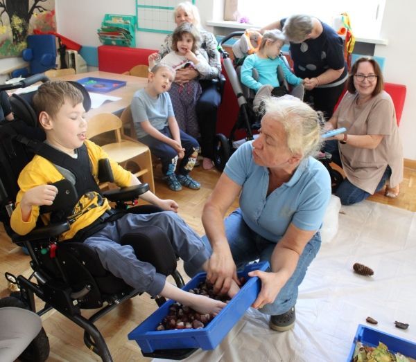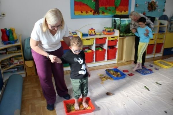 W miesiącu październiku pierwszym zadaniem było przygotowanie oraz przejście ścieżki sensorycznej. W ramach zajęć dzieci wspólnie tworzyły ścieżkę z różnorodnych materiałów o odmiennych fakturach i strukturach, takich jak: piasek, kamyki, liście, szyszki, gąbki, elementy naturalne zebrane podczas spaceru oraz pomocy znajdujących się w sali rehabilitacyjnej. Po przygotowaniu trasy dzieci miały możliwość jej przejścia- zarówno w skarpetkach, jak i na boso - co pozwoliło im doświadczyć różnych bodźców dotykowych.