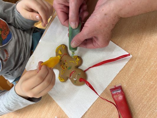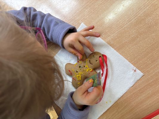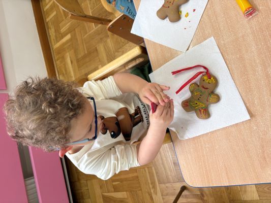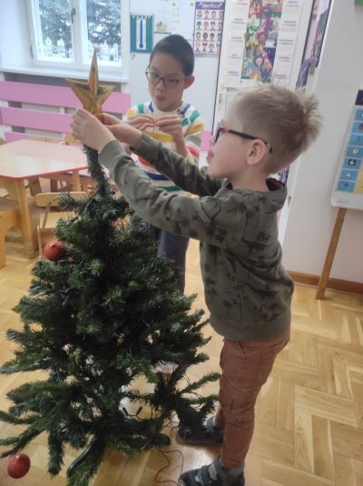 Pod koniec miesiąca realizowany był temat Przygotowania do świąt bożonarodzeniowych. Dzieci uczestniczyły w świątecznych aktywnościach, słuchały kolęd oraz poznawały symbole związane z Bożym Narodzeniem.