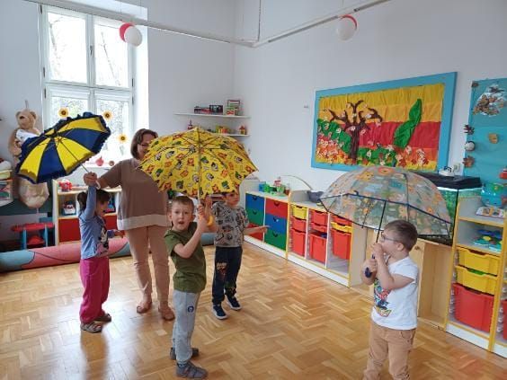 W ramach zajęć plastycznych powstały piękne, jesienne parasole, a także kilkuetapowe prace łączące motywy jesieni i zimy, które pozwoliły najmłodszym ćwiczyć dokładność, koncentrację oraz kreatywne myślenie. Cały miesiąc upływał również pod znakiem muzyki — dzieci poznały nowe, jesienne piosenki, do których, zgodnie z przygotowaną choreografią, tańczyły z parasolkami, świetnie łącząc rytm z ruchem.