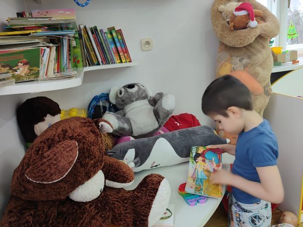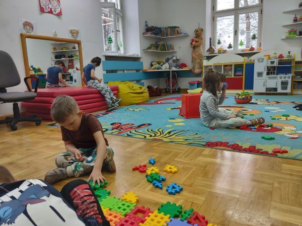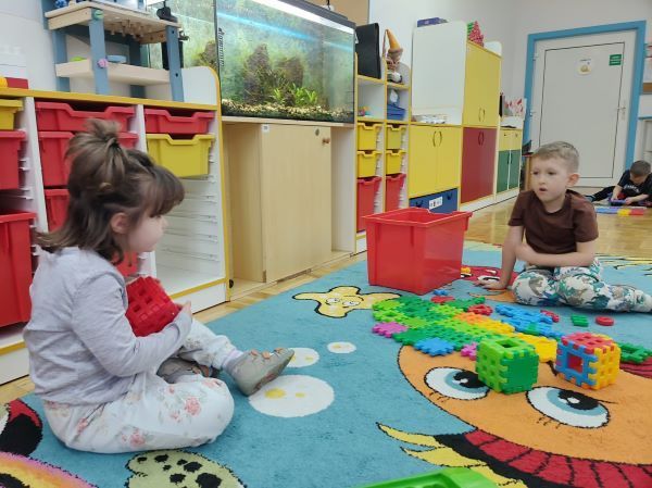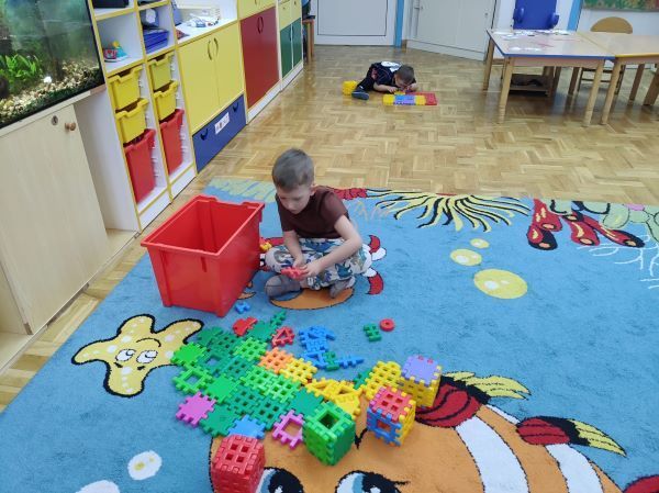 Dzieci z zaangażowaniem układały mozaiki z kolorowych klocków, rozwijając przy tym spostrzegawczość i wyobraźnię. Chętnie sięgały także po swoje ulubione książki, które oglądały podczas spokojnych chwil w kąciku czytelniczym.