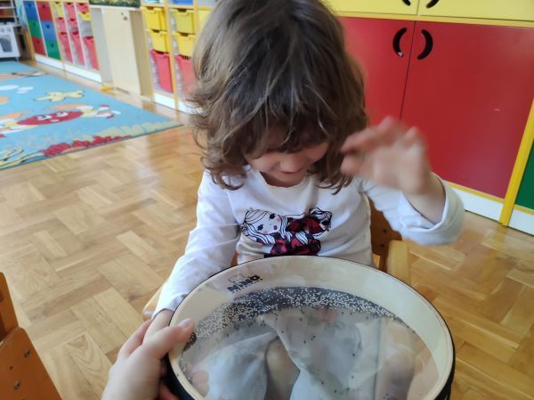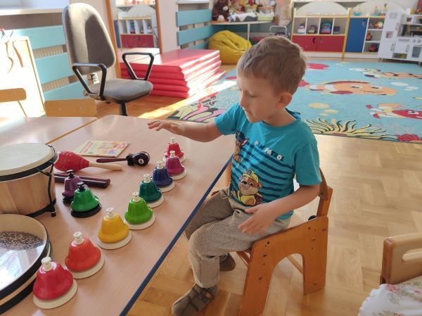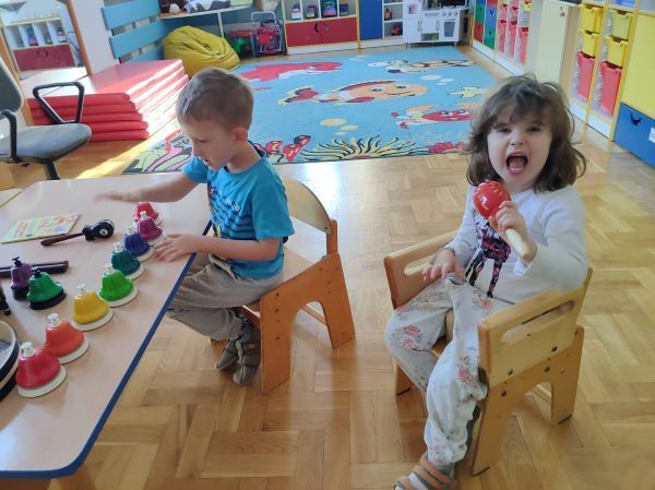 Nie zabrakło także pierwszych kroków w świecie muzykowania. Przedszkolaki uczyły się grać na instrumentach melodycznych i perkusyjnych, a zdobyte umiejętności wykorzystały podczas wspólnego akompaniowania do piosenki „Kap, kap”.