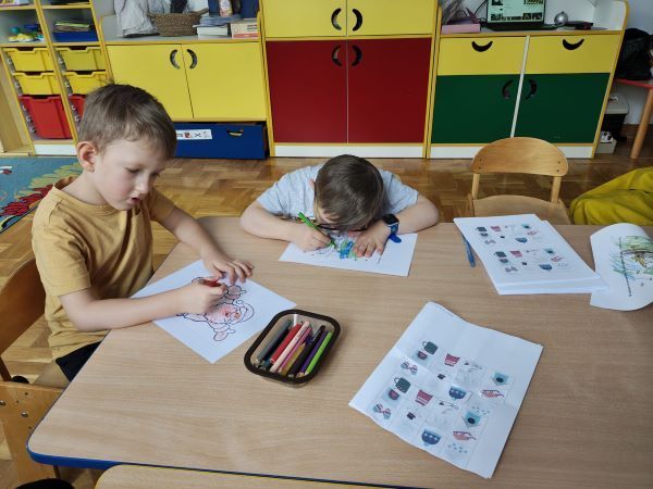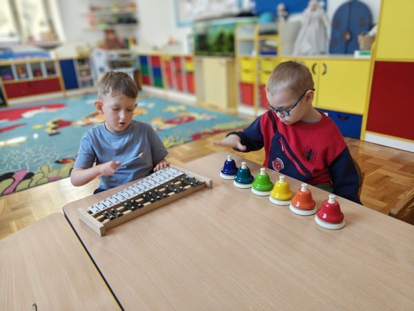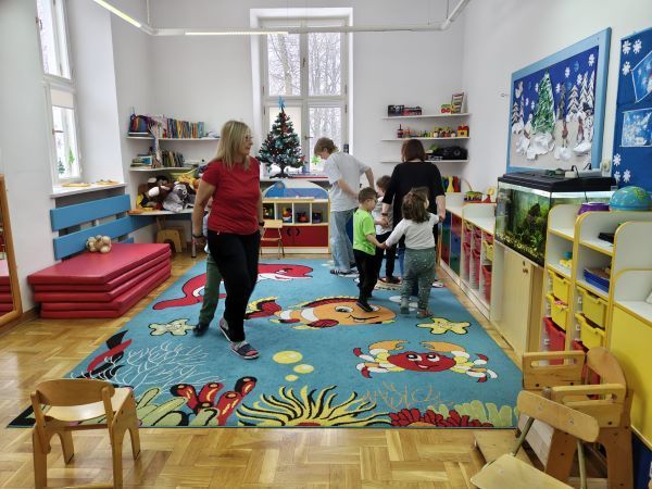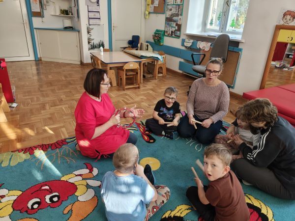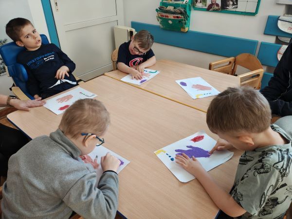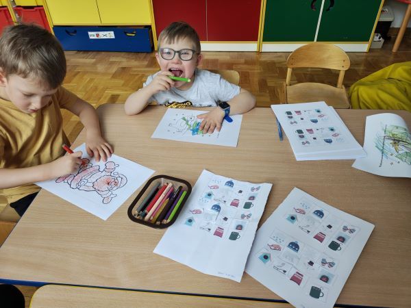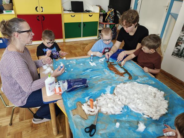 Styczeń w grupie niebieskiej upłynął w atmosferze bezpieczeństwa, którą budowały stałość i przewidywalność codziennych działań. Dzieci uczestniczyły w różnorodnych aktywnościach wspierających ich harmonijny rozwój. Zajęcia muzyczno-ruchowe sprzyjały usprawnianiu motoryki dużej, koordynacji wzrokowo-ruchowej oraz orientacji przestrzennej, a zabawy przy muzyce wspierały rozwój percepcji i koncentracji uwagi. Aktywności plastyczne i muzyczne, w tym relaksacja przy różnych gatunkach muzyki, wspomagały regulację emocjonalną oraz integrację sensoryczną. Wspólne doświadczenia wzmacniały poczucie przynależności i integrację dzieci w grupie.
