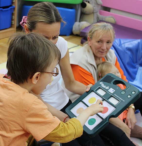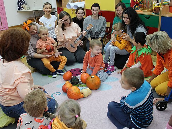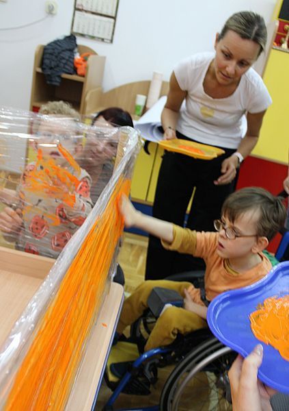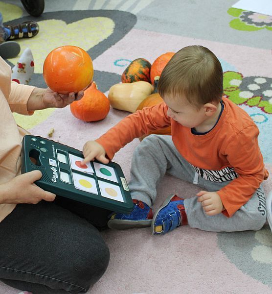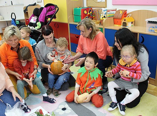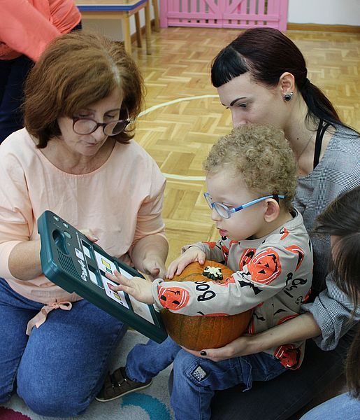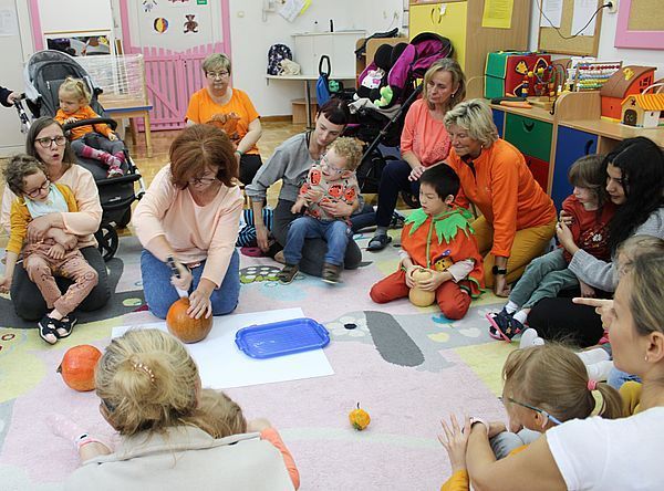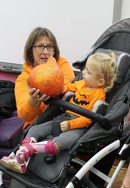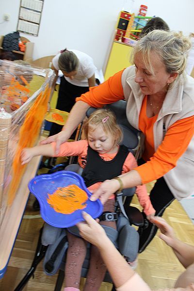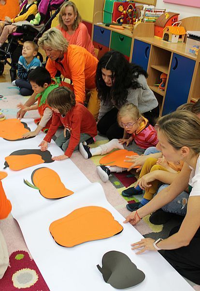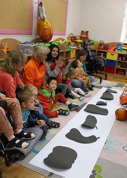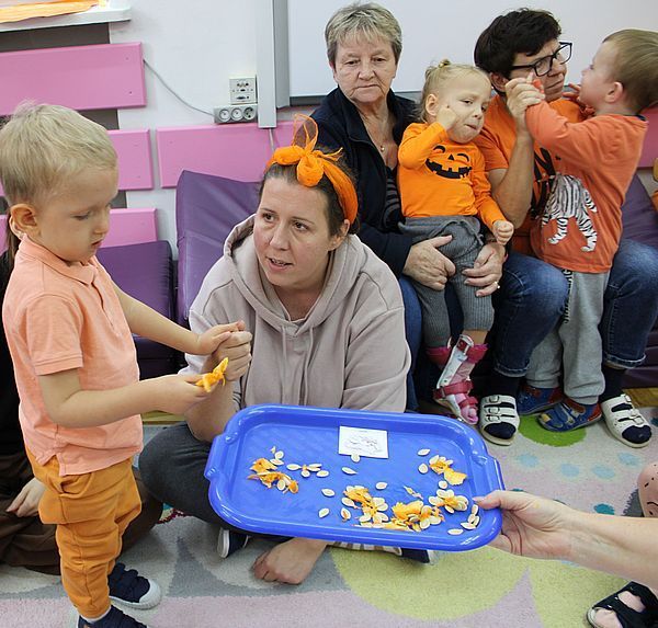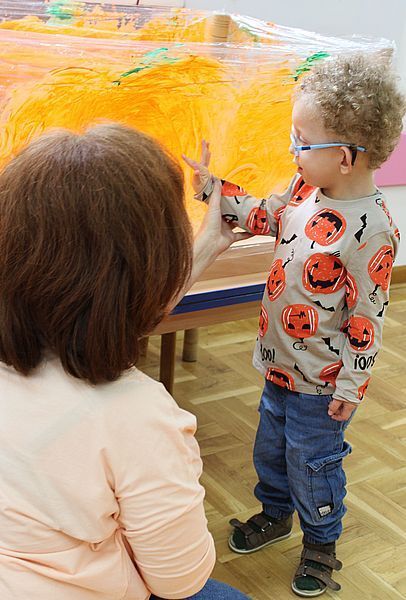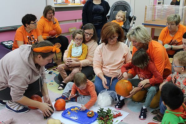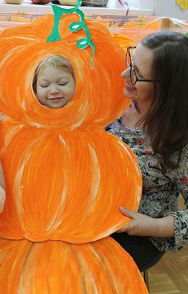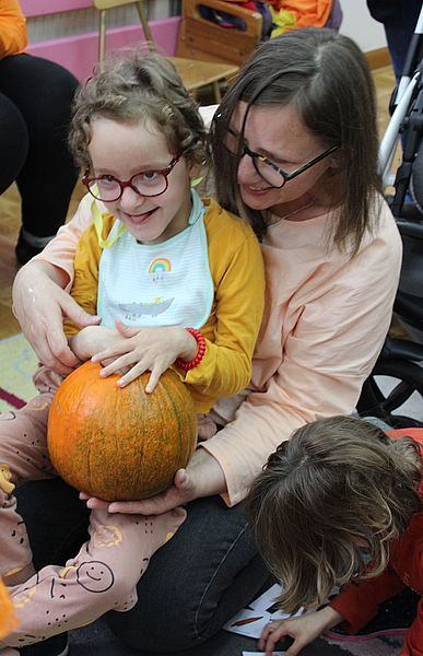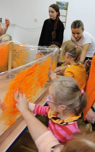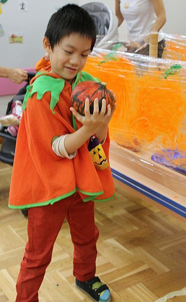 Wspólnie ze wszystkimi grupami bawiliśmy się kolorem pomarańczowym i wszystkimi jego odcieniami. Śpiewaliśmy interaktywną piosenkę o dyni - "Dynia w górze, dynia w dole..." Razem szukaliśmy dużej i małej dyni, zielonej i pomarańczowej, a następnie podzieleni na dwie grupy szukaliśmy takich samych dyń - obraz i cień. Na koniec wspólnie przygotowaliśmy jesienny stroik z dynią w roli głównej. Dzieci miały również okazję namalować dynię na foli. Bardzo im się to podobało.