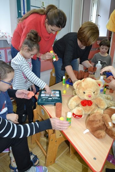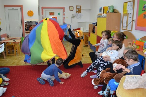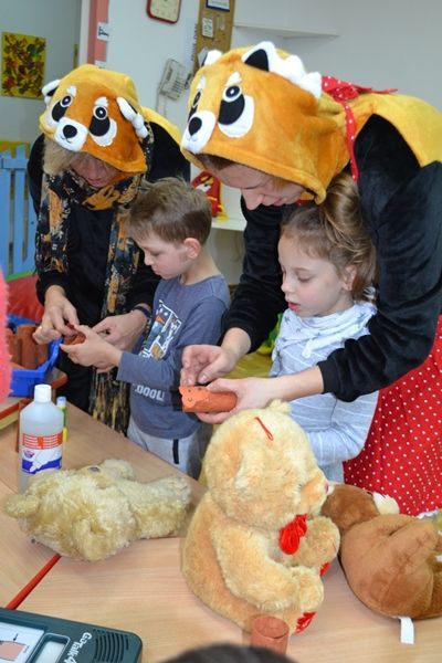 Każdy mógł przynieść swoją ulubioną przytulankę. Pani Agnieszka, Sabina, Ania i Asia przygotowały teatrzyk dla dzieci na podstawie opowiadania pt.:"Kto przytuli Misia Tulisia". Mogliśmy też wykonać swoje misie z papieru.