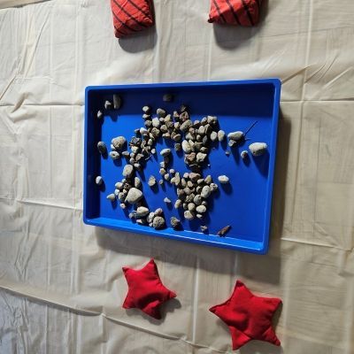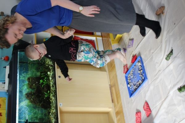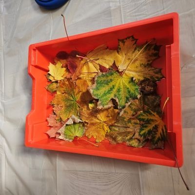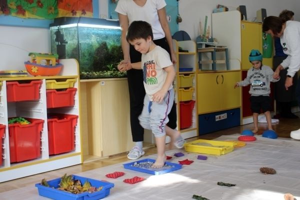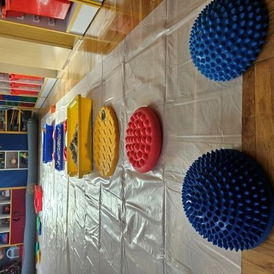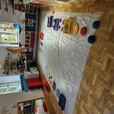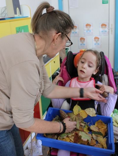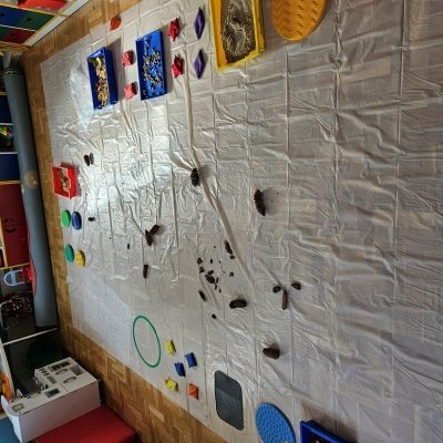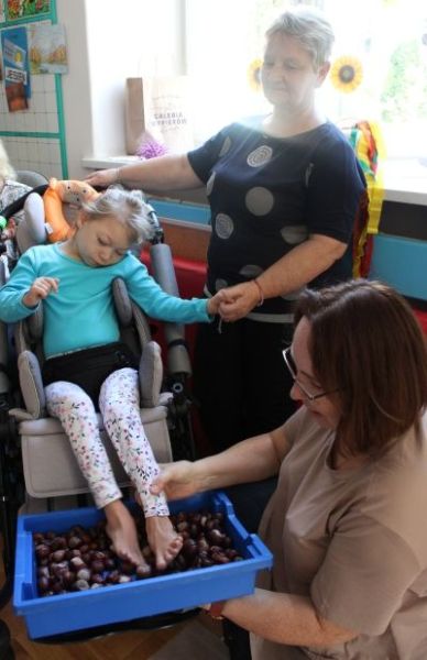 W miesiącu październiku pierwszym zadaniem było przygotowanie oraz przejście ścieżki sensorycznej. W ramach zajęć dzieci wspólnie tworzyły ścieżkę z różnorodnych materiałów o odmiennych fakturach i strukturach, takich jak: piasek, kamyki, liście, szyszki, gąbki, elementy naturalne zebrane podczas spaceru oraz pomocy znajdujących się w sali rehabilitacyjnej. Po przygotowaniu trasy dzieci miały możliwość jej przejścia- zarówno w skarpetkach, jak i na boso - co pozwoliło im doświadczyć różnych bodźców dotykowych.