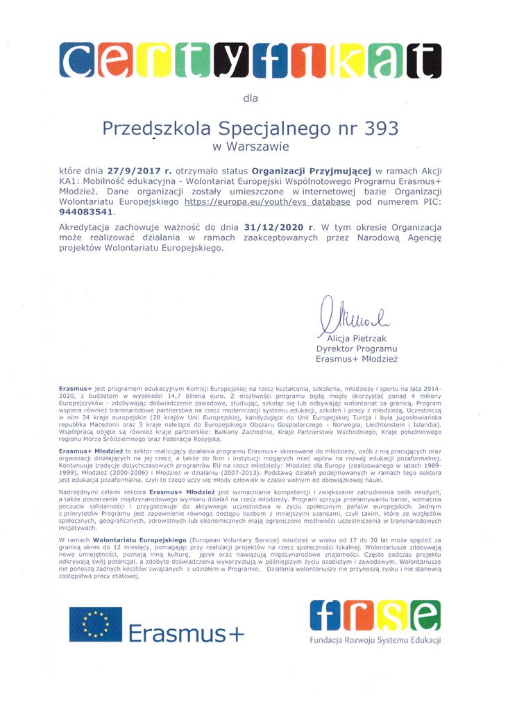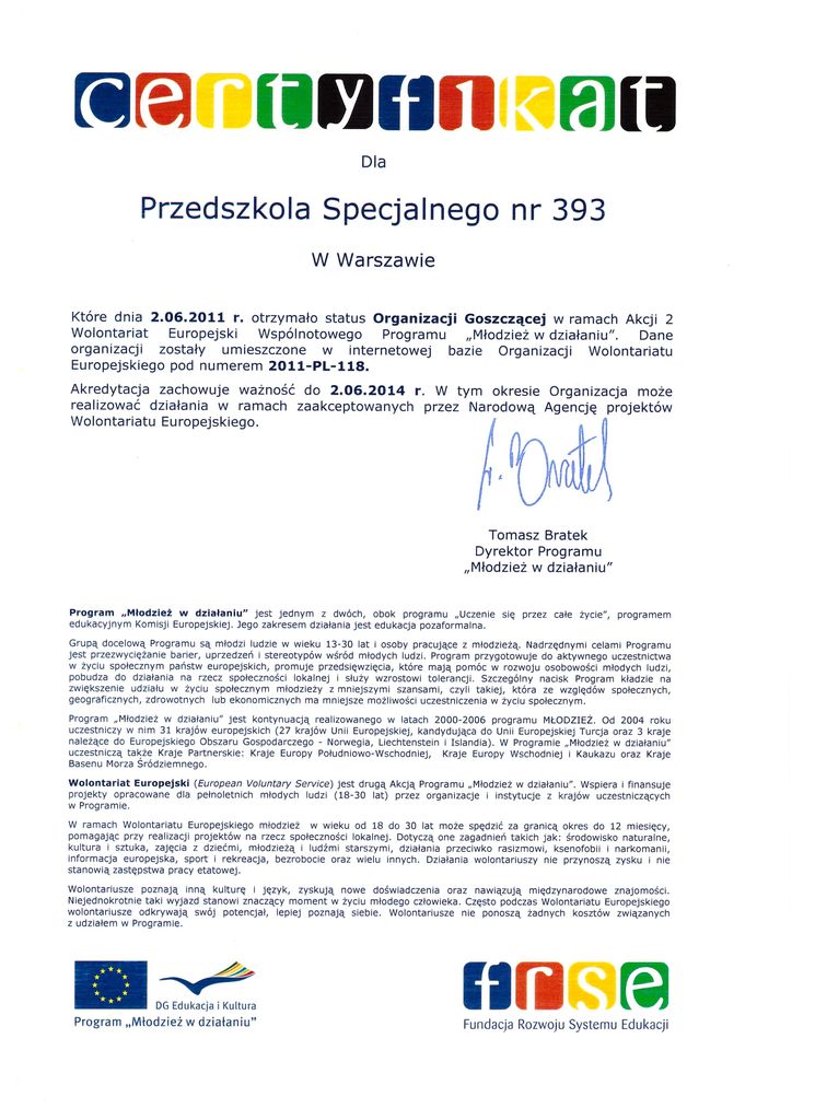 Jednak EVS to nie tylko szansa na przygodę dla młodych ludzi, ale także możliwość dla organizacji, w których wolontariusze pracują. Młodzi i dynamiczni ludzie, pełni pomysłów i zapału do pracy zawsze wnoszą świeży powiew do organizacji. Tak samo my, pełni nadziei pisaliśmy list intencyjny, konieczny do zakwalifikowania Przedszkola, do przyjmowania zagranicznych wolontariuszy. Spełniając wszelkie wymagania dostaliśmy tzw. „zielone światło” i dzięki temu od września 2008 roku gościmy wolontariuszy. Przyjeżdżają do nas na 9 lub 10 miesięcy.