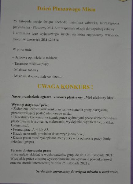 Drogie dzieci i drodzy rodzice zapraszamy do wzięcia udziału w konkursie plastycznym z okazji "Dnia Pluszowego Misia".
