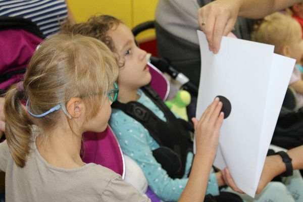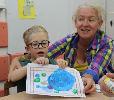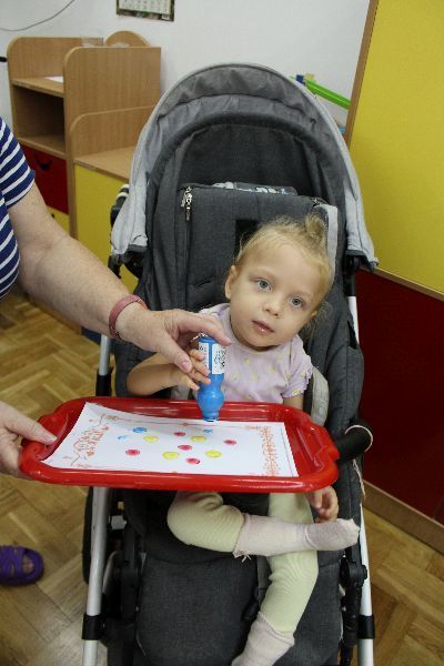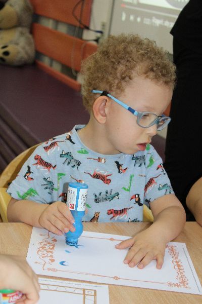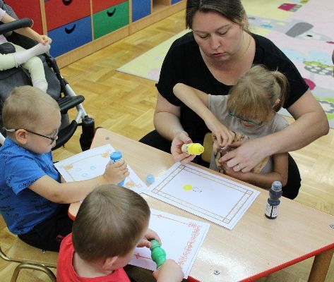 Dzieci poznały historię Petera H Reynoldsa pt. "Kropka". Rozmawialiśmy o tym, że każdy z nas ma jakiś talent i nawet zwykła "kropka" może okazać się wspaniałym dziełem sztuki. Wspólnie bawiliśmy się przy muzyce i każde dziecko namalowało swój obraz.