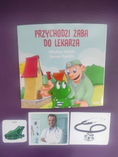 4. Zajęcia dydaktyczno-wychowawcze w grupie Żółtej. Temat: Kim jest i co robi weterynarz? Wykorzystanie książki „Przychodzi żaba do lekarza”. Autorzy: Wiesław Drabik, Dorota Szoblik.