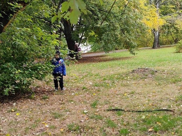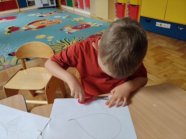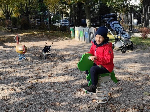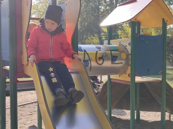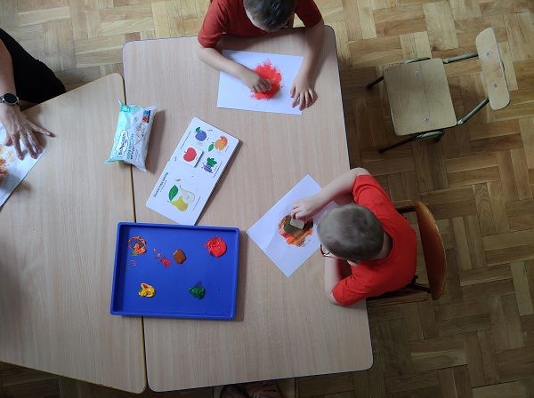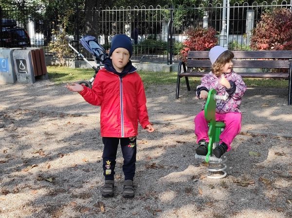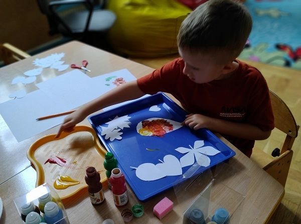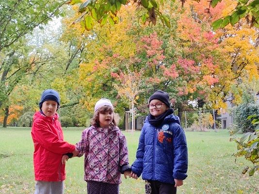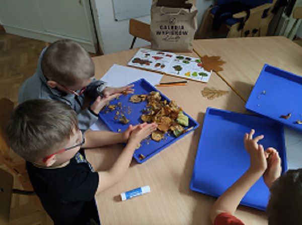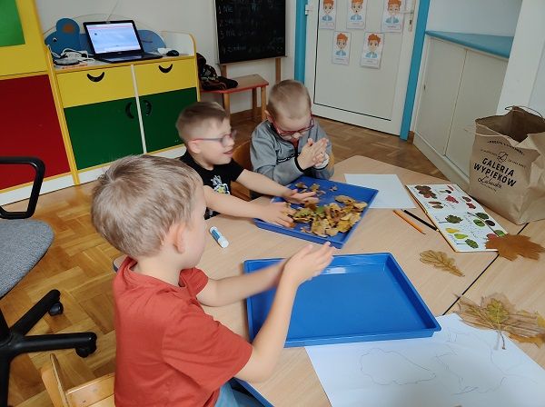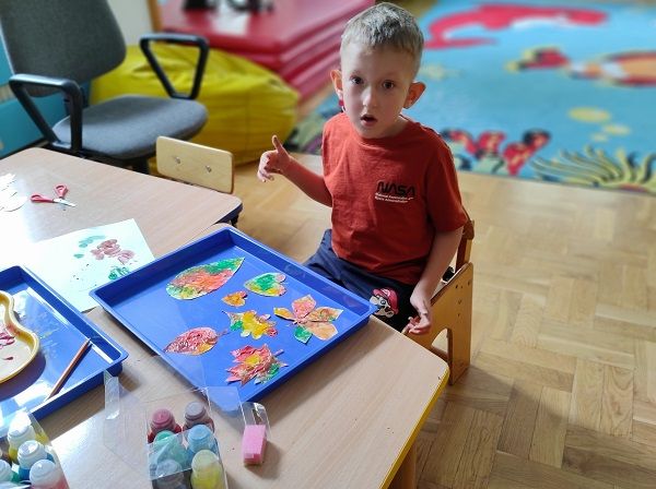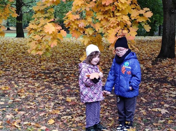 W październiku przedszkolaki z grupy Niebieskiej korzystały z pięknej, słonecznej pogody złotej polskiej jesieni. Niemal codziennie wraz z nauczycielką i opiekunkami wybierały się na spacery do pobliskiego parku, gdzie podziwiały przyrodę, zbierały barwne liście oraz poznawały zasady zabawy w chowanego, ucząc się przy tym wyliczanek i liczenia w zakresie 5 i 10. Dzieci odwiedziły również ogródek jordanowski, w którym z radością bujały się na sprężynowych konikach i zjeżdżały ze zjeżdżalni. W przedszkolu natomiast tworzyły piękne, jesienne prace plastyczne inspirowane wspólnymi spacerami i obserwacjami przyrody.