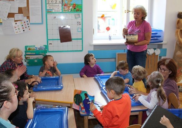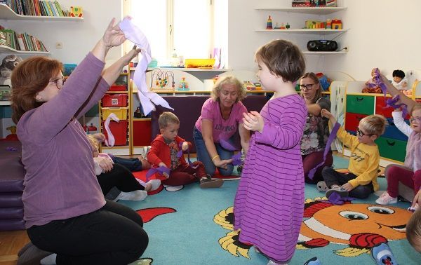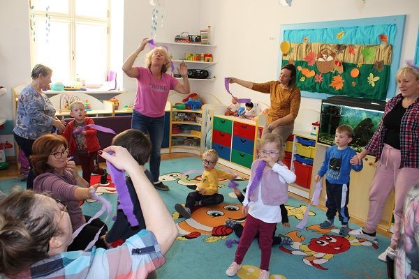 Dzieci powitały się zabawą pt. „Mam taki kolor” – prezentując kolory na swoich ubraniach. Przedszkolaki rozpoczęły swój dzień fioletowy od ćwiczeń oddechowych z wykorzystaniem pasków fioletowej bibuły. Następnie oglądały zdjęcia śliwek i przetworów, które ze śliwek można wyczarować, a później roztańczyły się przy piosence "Śliwka robaczywka". Była także rymowanka - kolorowanka „trzy śliwki”.