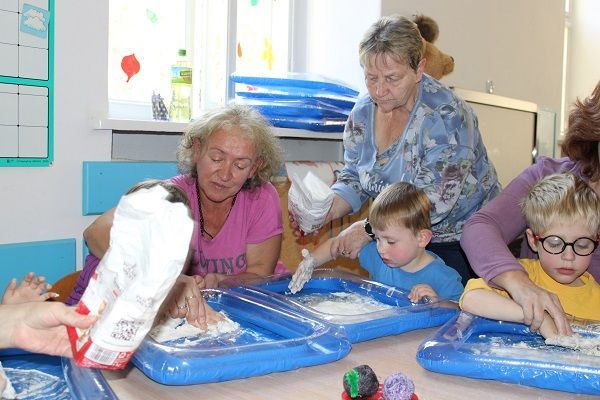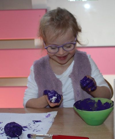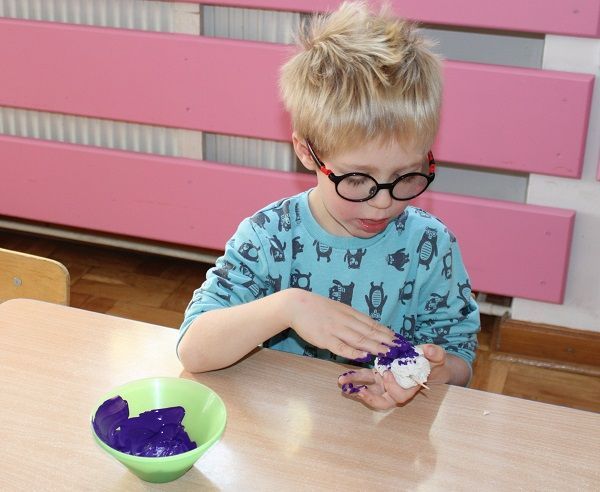 Na koniec zajęć dzieci bawiły się wykonaną przez siebie żelkoliną. Postanowiliśmy wykorzystać znany wszystkim przysmak – galaretkę (oczywiście w kolorze fioletowym) – w dość nietypowy sposób. Jej słodka, kolorowa i żelowa forma dostarczyła dzieciom wielu ciekawych doświadczeń sensorycznych, stymulując ich zmysł węchu, smaku i dotyku. Stworzona z niej masa, zwana Żelkoliną bardzo spodobała się naszym przedszkolakom, a zabawa nią dała im możliwość na rozwijanie wyobraźni . Dzieci stworzyły z żelkoliny śliwki, które po wyschnięciu pomalowały, oczywiście na fioletowo.