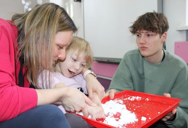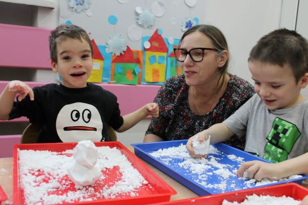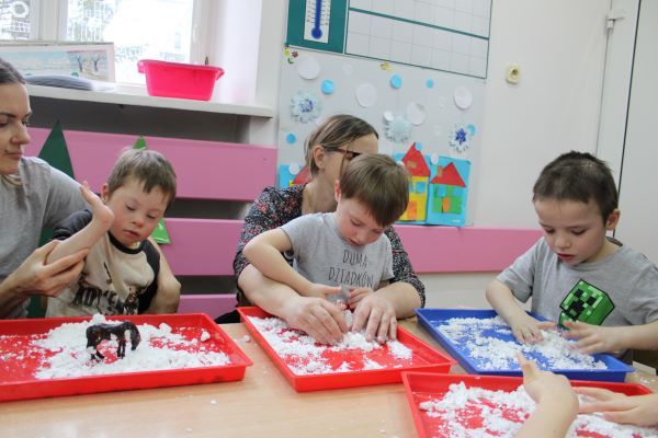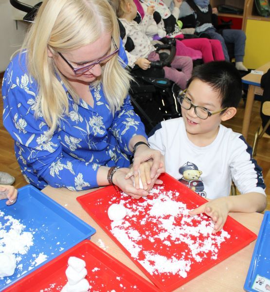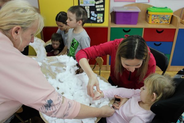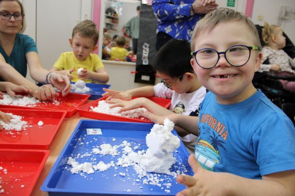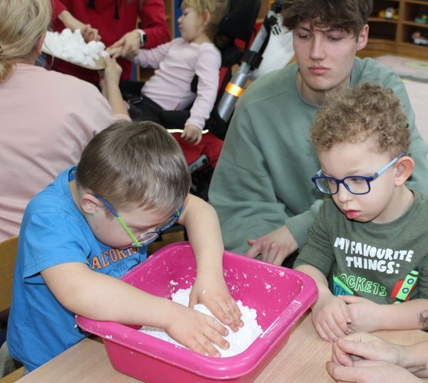 Śniegu rzeczywiście na dworzu nie było więc stworzyliśmy go sami - połączliśmy mąkę ziemniaczaną, piankę do golenia i odżywkę do włosów.