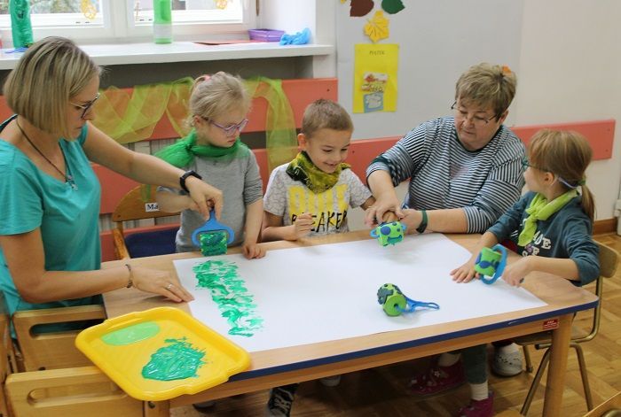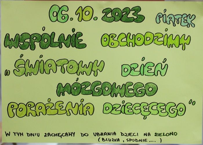 Symbolem Światowego Dnia Porażenia Mózgowego jest kolor zielony. W naszym przedszkolu z okazji tego dnia przygotowaliśmy prace plastyczne w kolorze zielonym, również zajęcia w tym dniu dotyczyły koloru zielonego.