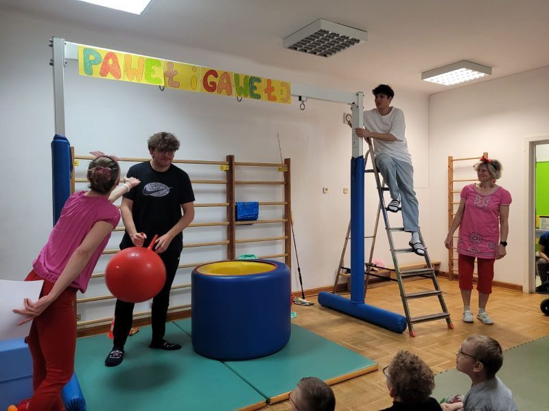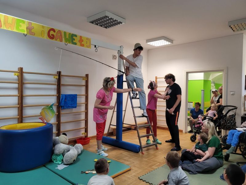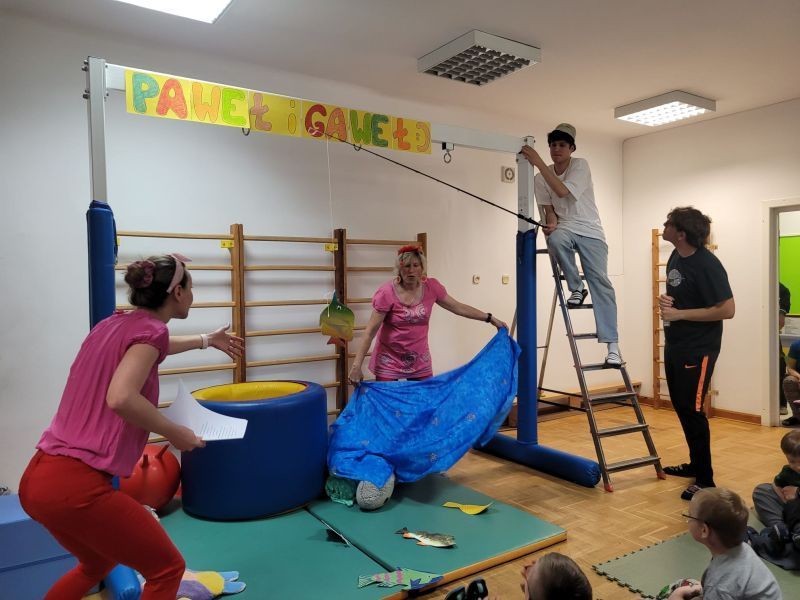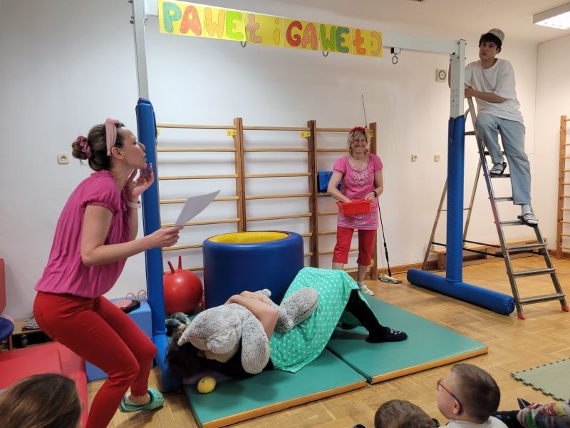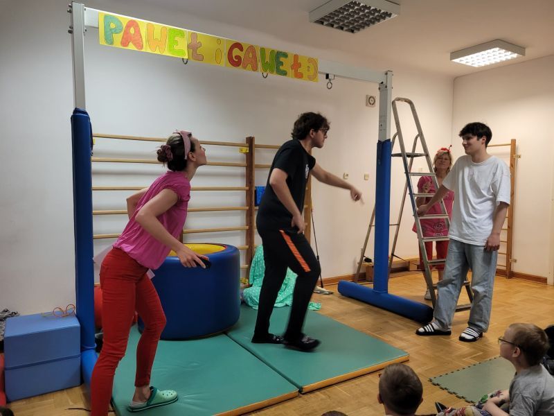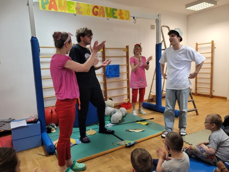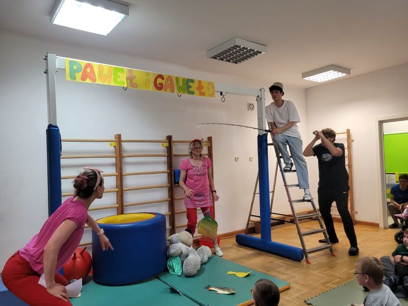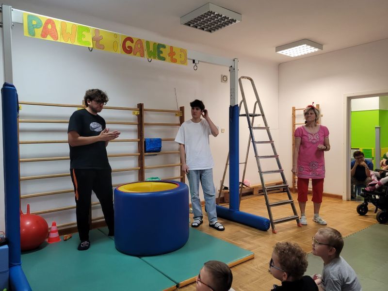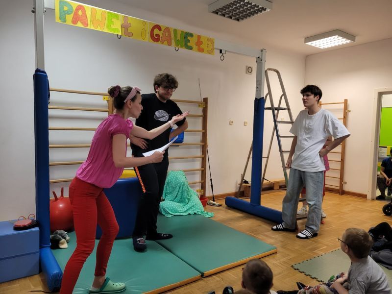W tym roku nasi wspaniali wolontariusze Emanuele i Anton z okazji Dnia Dziecka przygotowali mini teatrzyk pt:”Paweł i Gaweł” na podstawie znanej wierszowanej bajki Aleksandra Fredry. Chłopcy mieli znakomitą okazję popisać się swoim kunsztem aktorskim. Dzieciaki były zachwycone. Razem z Paniami wołały Bis bis bis. Anton zagrał spokojnego Pawła-pokojowego wędkarza, a Emanuele wcielił się w rolę szalonego zawadiaki i rozbójnika. Oj, działo się, działo…Głośno dosyć było, aż szyby z okien wyrzuciło.