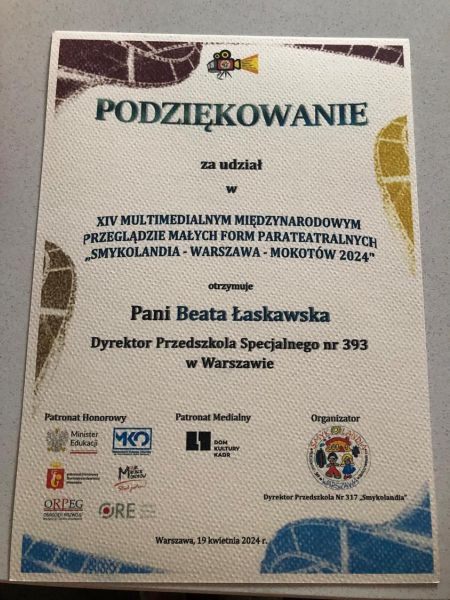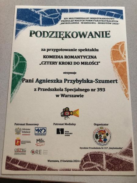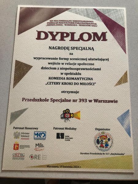 Nagroda specjalna dla Przedszkola Specjalnego nr 393 za przedstawienie teatralne pod tytułem: "Komedia romantyczna. Cztery kroki do miłości".